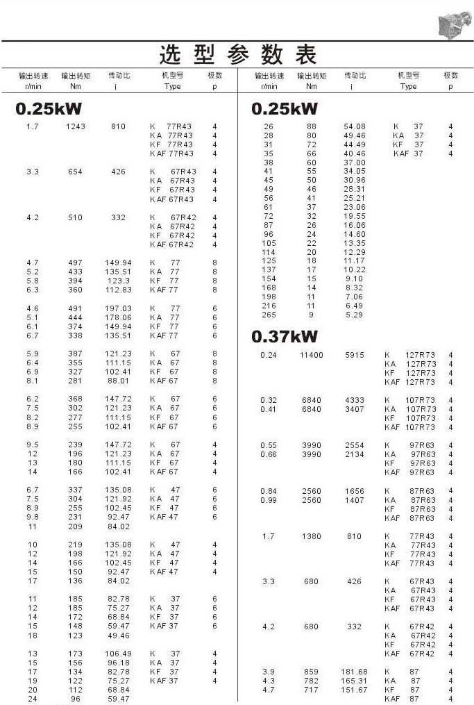 選型參數(shù)表0.25kW和0.37kW